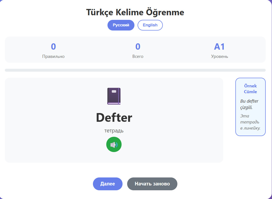Тренируем лексику по странам и местам (Türkiye, Rusya, okul, hastane и др.), а также базовые слова «кто/что». Мини-подсказки на русском, простые примеры на турецком, чёткий прогресс. Подходит для самостоятельного занятия: мало текста, больше практики и мгновенная обратная связь.